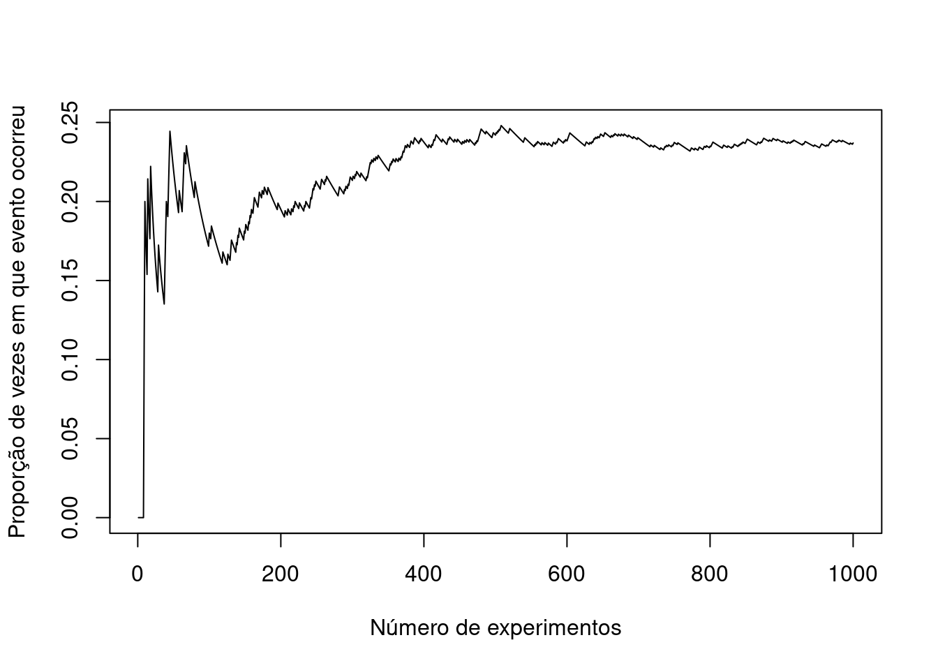 Por exemplo, a figura abaixo apresenta a proporção de vezes que um evento ocorre para vários possíveis números de realizações de experimentos independentes. Qual a probabilidade de ocorrência do evento?