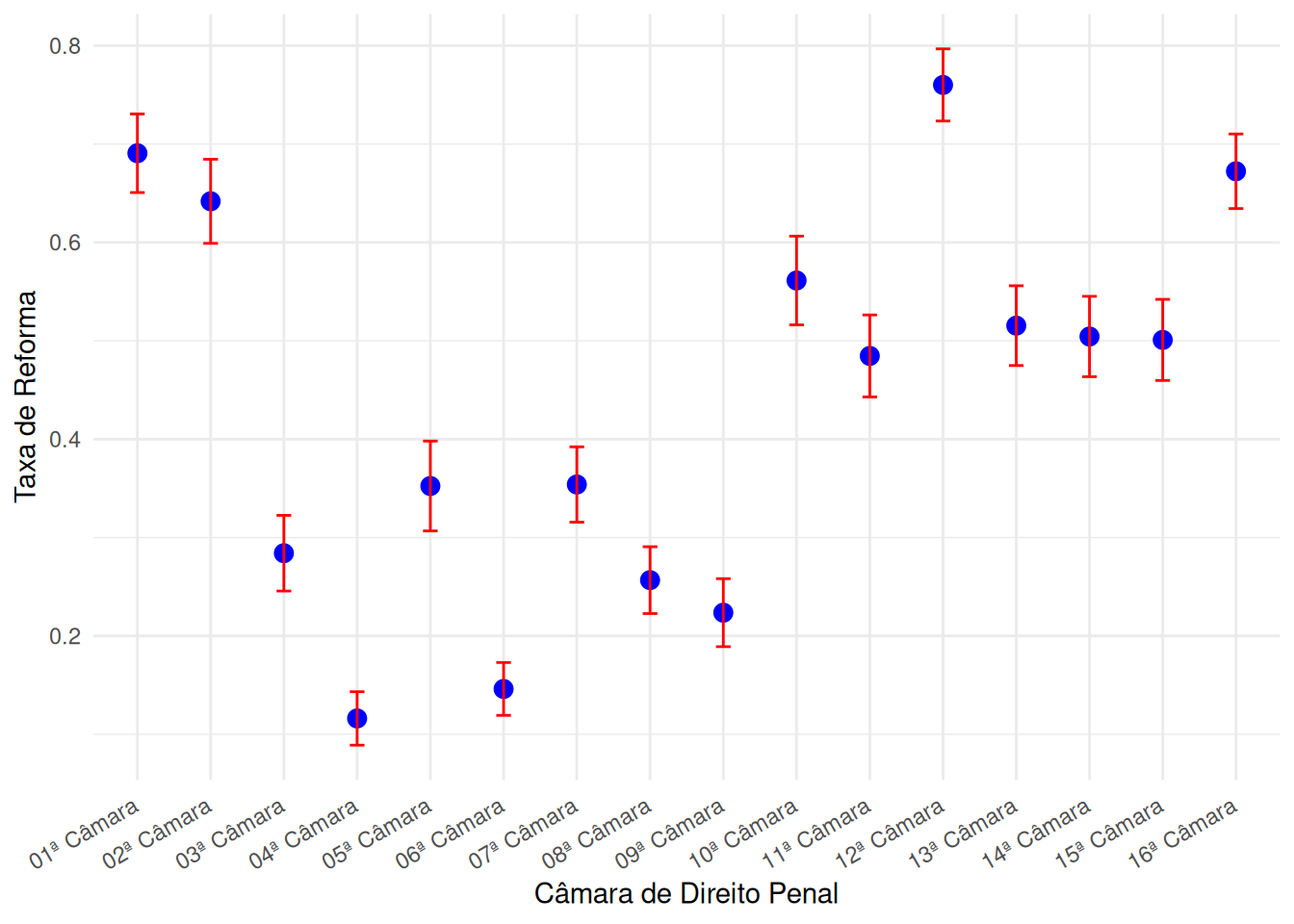 Os pontos azuis indicam a taxa de reforma empírica que foi observada para cada Câmara. Existem duas possíveis explicações quando uma taxa de reforma é maior do que outra: ou uma Câmara sistematicamente reforma sentenças mais frequentemente do que outra, ou este padrão é observado na amostra por mera flutuação aleatória dos dados. Podemos utilizar os intervalos de confiança para diferenciar entre estes casos.