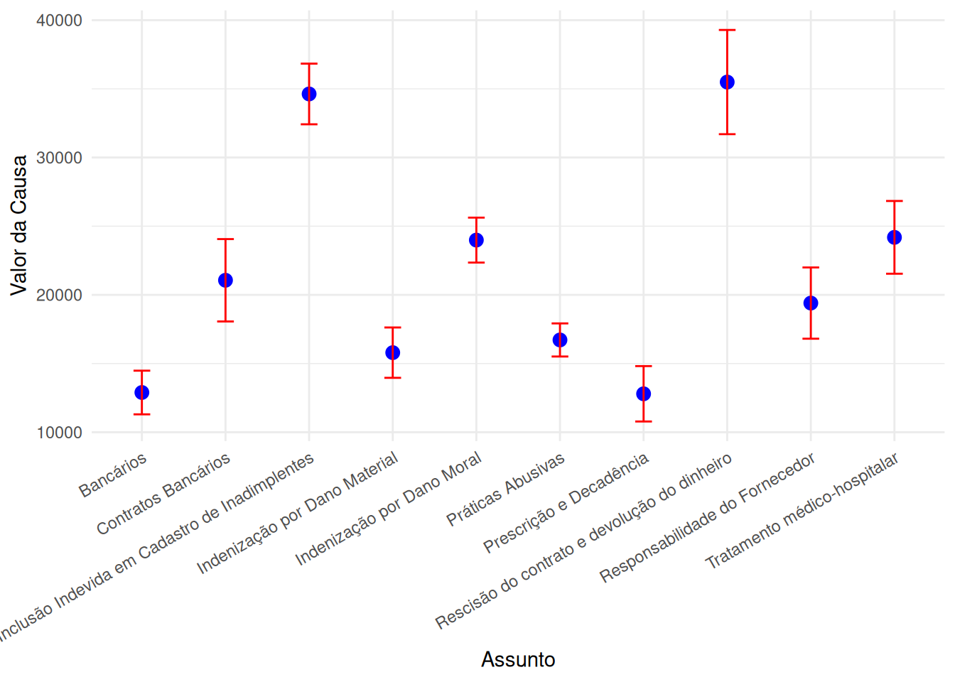 O gráfico a seguir apresenta intervalos de confiança para o valor da causa para os \(10\) assuntos mais frequentes em ações cíveis:
